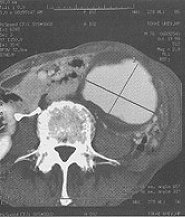 腹部のCTは図❷のとおりで、大きな大動脈瘤があり、心血管外科に依頼した。破裂する危険があるので至急手術をしますとの返事。この説明に、患者さんは立派な人物で、「重要な病気をみつけていただき、ありがとうございました」と礼を言われた。小出教授の執刀で人工血管置換の大手術が行われた。術後の経過はきわめてよく、1ヵ月後には口腔外科の病棟に転棟し、顎骨の腫瘍の手術をした。病理診断は歯原性嚢胞であった。