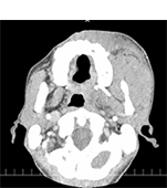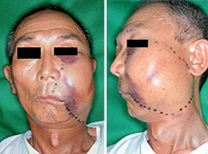 現症:体格中等度、栄養状態不良、体温は37.4℃。左側眼窩下部から左側頬部にかけて、び漫性の腫脹と部分的に皮下出血斑を認めた。頬部の腫脹部には波動を触知した。