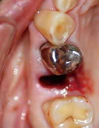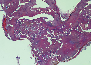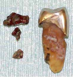 抜歯および周囲病変部の摘出を局所麻酔下に行った。鉗子にて右上5を抜歯後、周囲の肉芽様組織の掻爬を行った。大小さまざまな複数の茶褐色の硬固物が歯根に付着していた(図❸❹)。抜歯窩骨面は正常で、上顎洞への交通なども認めなかった。摘出物は、病理組織検査に提出し、炎症性肉芽組織および歯石との診断を得た(図❺)。