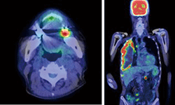 図❸ PET-CT所見。6部のほか、右側胸膜、腸間膜リンパ節、右側殿筋に高集積を認める
