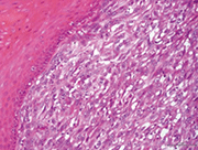 図❺ 病理組織像(H-E染色 ×200)。歯肉扁平上皮(左方)下に紡錘形腫瘍細胞塊を認める