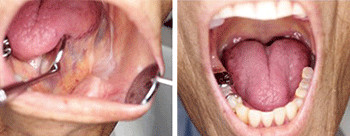 図❻ 術後口腔内写真(左)と義歯装着時(右)