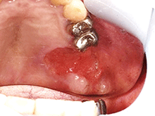 既往歴:3ヵ月前より左側上顎歯肉部の接触痛を自覚、疼痛のため部分床義歯が装着できなくなり近在歯科を受診した。左側上顎臼歯部義歯床下歯槽頂粘膜に発赤と接触痛を認めたため、ステロイド軟膏を処方し約1ヵ月間経過観察を行ったが、改善が得られないとのことで当科紹介となった。