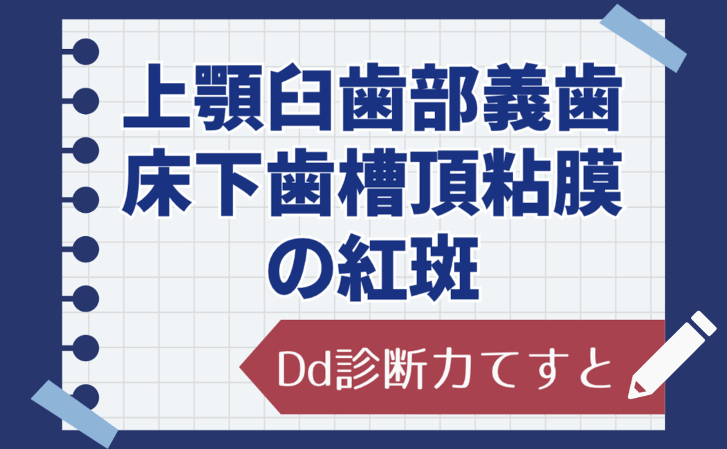 現病:体格中等度、栄養状態は良好。顔貌は左右対称、頸部リンパ節腫脹は認めなかった。口腔内所見として、左側上顎臼歯部歯槽頂に20×18mm大の境界明瞭でやや陥凹した紅斑を認め、軽度の接触痛を伴っていた(図❶)。