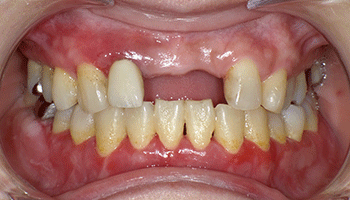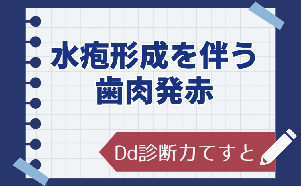現病歴:半年ほど前より、上下顎のさまざまな部位の歯肉に発赤と、ときどき水疱形成も認めるようになった。疼痛もあることから、かかりつけの歯科医院を受診したところ、歯肉炎の診断でブラッシングなどの口腔清掃指導と歯周治療を受けた。その後も症状は改善することなく、近在の皮膚科を受診するも原因がはっきりしなかったため、精査加療の目的で当院を受診した。