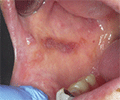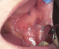 現病歴:血液内科での骨髄腫に対する治療(多剤化学療法)に伴い、2015年12月より定期的な口腔管理を行っていたが、とくに異常はみられなかった。その後、一時治療が中断していたが、2017年5月下旬、両側頬粘膜の違和感を自覚し、再初診となった。
