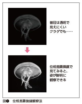 この微小な位相差を、特別な光学部品(位相板)を使って明暗のコントラストに変換することで、透明な構造でもはっきりと像として観察できるようにしたのです(図5、6)2,5)。