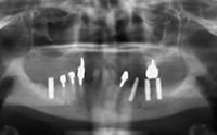 現病歴:初診2ヵ月前より左側下顎の違和感を認めた。歯科医院を受診し、左側下顎臼歯部の補綴物(インプラント上部構造)を除去し、洗浄。抗菌薬を処方されたが症状の改善を認めないため、当科紹介受診となった。