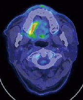 PET-CTでは右側口蓋部および頸部にFDGの異常集積を認めた(図❷)。画像検査後に行った生検で悪性黒色腫と診断されたので、治療は高次医療機関に依頼したが、受診は中断され、以後の経過は不明となった。