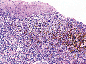淡好酸性の胞体を有する腫瘍細胞が上皮直下から粘膜下層深部に小胞巣状・索状に増殖・浸潤している。胞体内にはメラニン顆粒を認め、核は類円形、卵円形、多角形で大小不同を伴い、大型で明瞭な核小体もみられる(図❸)。免疫染色で腫瘍細胞はS-100およびHMB-45陽性、LCA陰性を示した。
