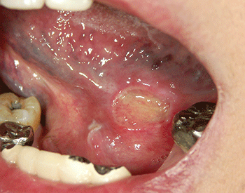 現病歴:約1ヵ月前に左口底部の痛みと、潰瘍を自覚し、かかりつけの歯科医院を受診した。左下臼歯部の義歯の調整とステロイド含有軟膏を処方されて経過観察となったが改善がないため、精査目的に当科に紹介受診した。