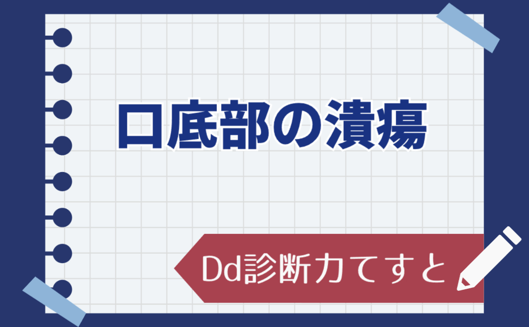 現症:左口底部に12x10mm大の疼痛を伴う浅い潰瘍を認めた(図1)。潰瘍面は平坦であり偽膜の形成などはみられず、潰瘍周囲にわずかな隆起がみられたが、硬結は触知しなかった。