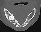 CT所見:軸位断では6部に不整形の塊状石灰化物を認め、周囲には帯状の透過像がみられ、その中に粒状の小石灰化像が散在していた。周囲の骨には硬化性変化がみられる(図❸)。