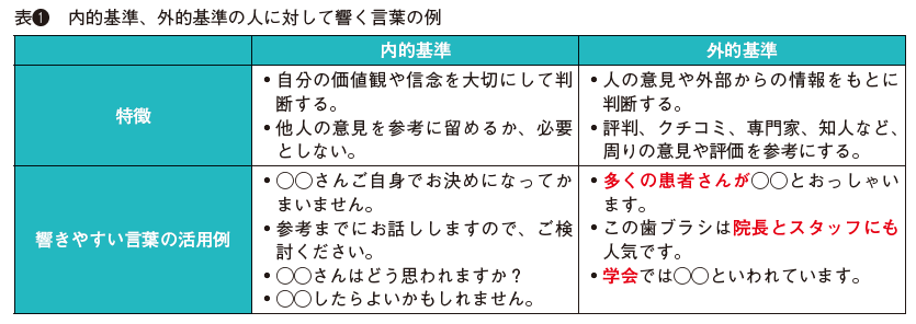 たとえば「私にはわからないので、お任せします」「おっしゃるとおりにやってみます」など、人の指示に従いたい言葉を発することも多いです。内的基準、外的基準の人には、それぞれ表1に示すような言葉が響きます。