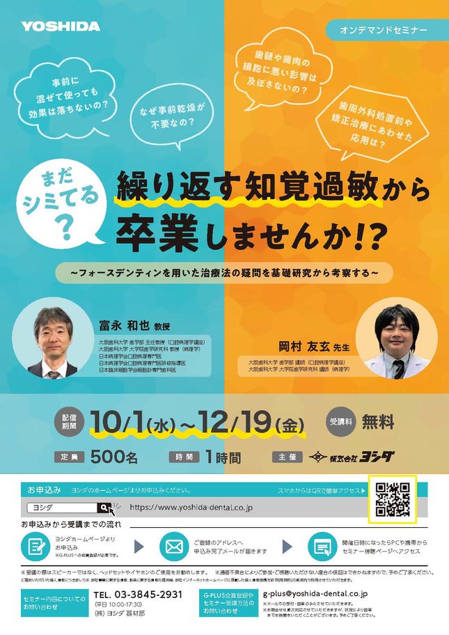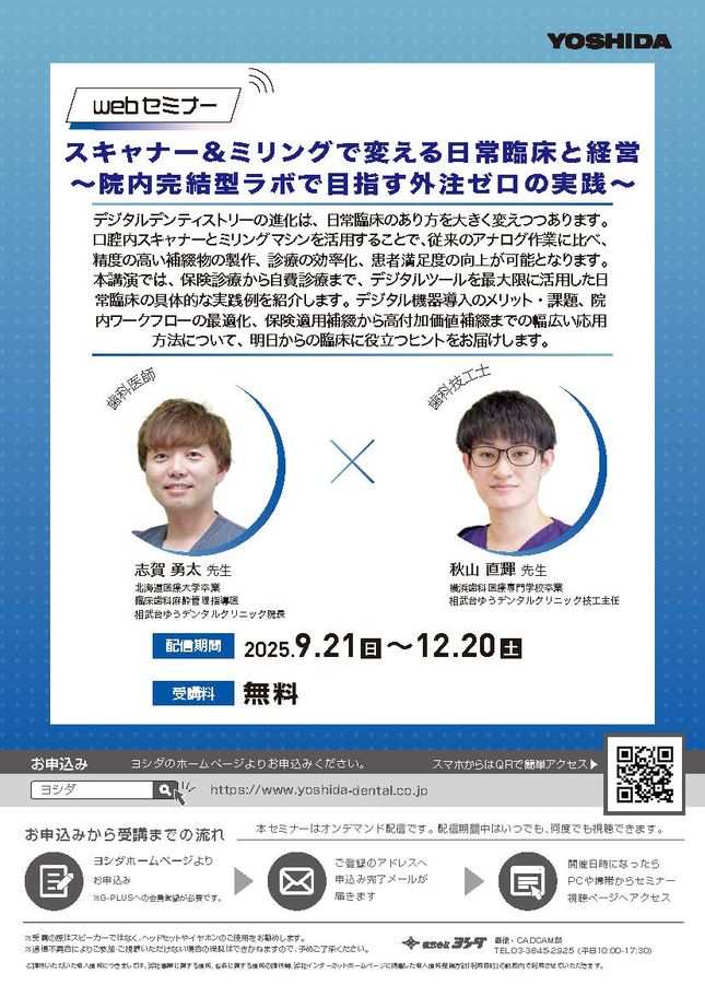 歯科技工士歯科医師歯科衛生士エンド・歯内療法その他高齢歯科・訪問歯科ホワイトニングインプラント・口腔外科小児歯科矯正歯科咬合・補綴予防歯科保存修復義歯・デンチャーCAD/CAM・技工歯科全般・その他【東京】ヨシダユーザーミーティング2026 講演〔ヨシダ〕