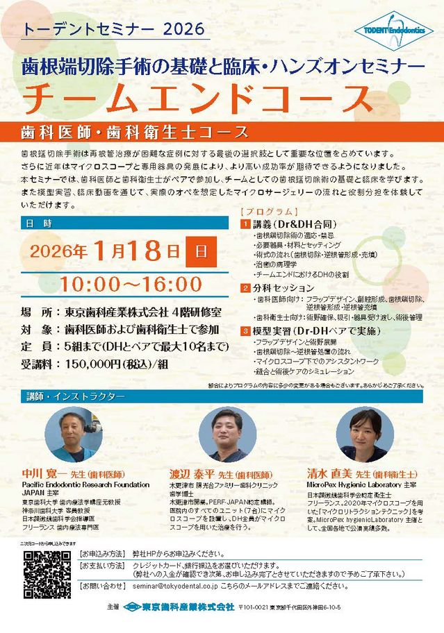 歯科衛生士歯科医師保存修復エンド・歯内療法インプラント・口腔外科【東京】歯根端切除手術の基礎と臨床・ハンズオンセミナー チームエンドコース〔東京歯科産業〕
