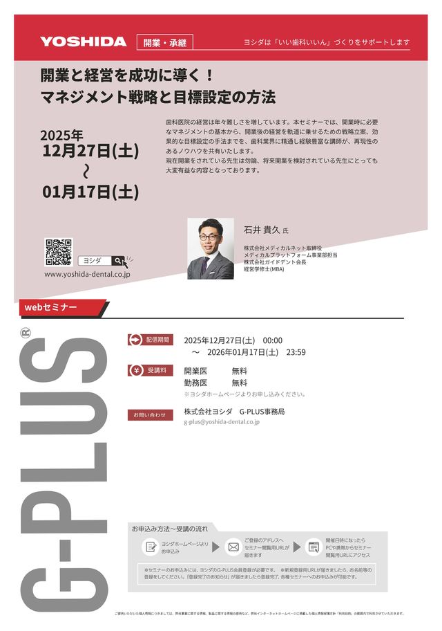 歯科医師矯正歯科【webセミナー】開業と経営を成功に導く!マネジメント戦略と目標設定の方法〔ヨシダ〕