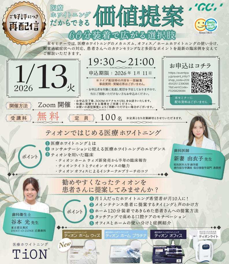 歯科医師歯科衛生士ホワイトニング【再配信】GC Webセミナー 医療ホワイトニングだからできる価値提案 ~60分装着で広がる選択肢~〔ジーシー〕