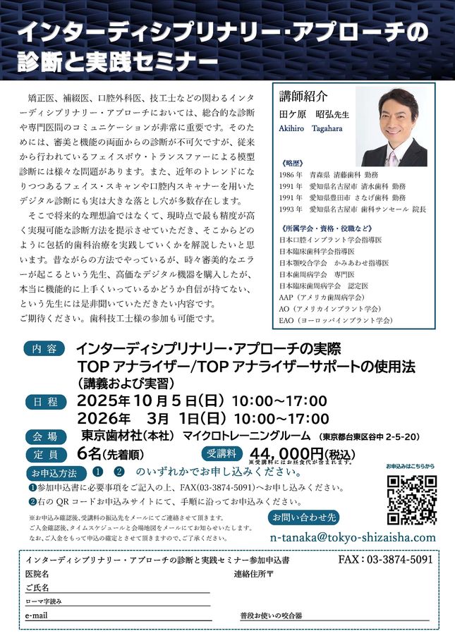 - 歯科医師:25,000円(昼食、消費税込)/ 歯科衛生士/スタッフ:15,000円(昼食、消費税込)