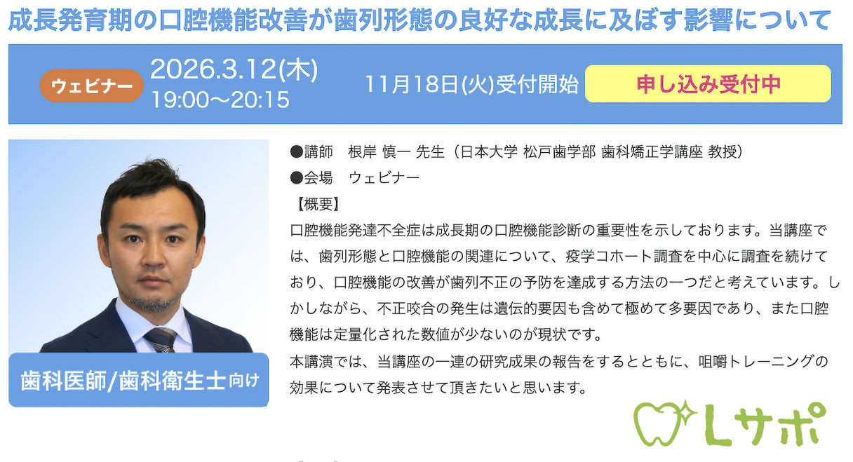 歯科医師歯科衛生士予防歯科矯正歯科小児歯科【ウェビナー】成長発育期の口腔機能改善が歯列形態の良好な成長に及ぼす影響について〔ライオン歯科材〕
