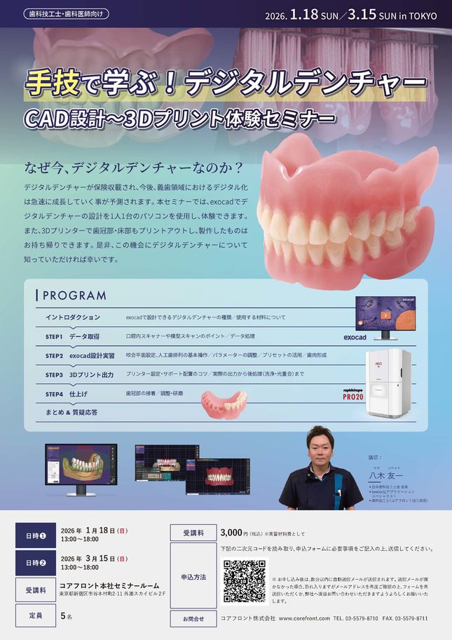 歯科技工士CAD/CAM・技工義歯・デンチャー【東京】手技で学ぶ!デジタルデンチャー CAD設計~3Dプリント体験セミナー〔コアフロント〕