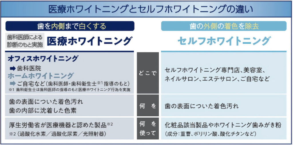 皆様は、歯科医院で行うホワイトニング「医療ホワイトニング」と、それ以外のホワイトニングの違いを患者様に説明できますか?